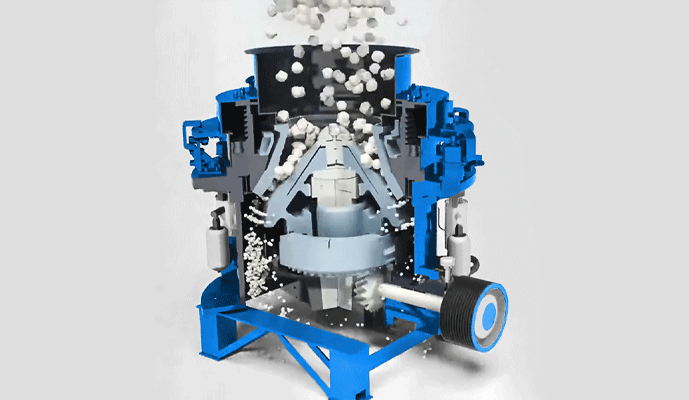 The moving core of the crusher rotates and reciprocates under the action of the eccentric sleeve. This motion causes the liners to squeeze and rub against the material, thus moving the material between the liners and the concave surface. According to the theory of interparticle crushing, the material is subjected to forces from multiple directions, eventually forming stable particles. Particles that meet the discharge requirements are discharged through the reciprocating gap between the liners, while the remaining material continues to be crushed until it reaches the required particle size.